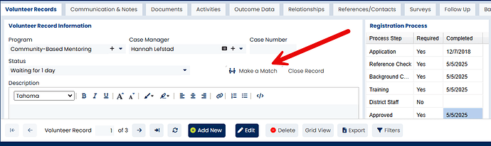 On the new volunteer/case record, click on the Make A Match button (available as long as the mentor is set to the status of Waiting) and select the appropriate mentee. Finish the process by selecting a match date and saving it.