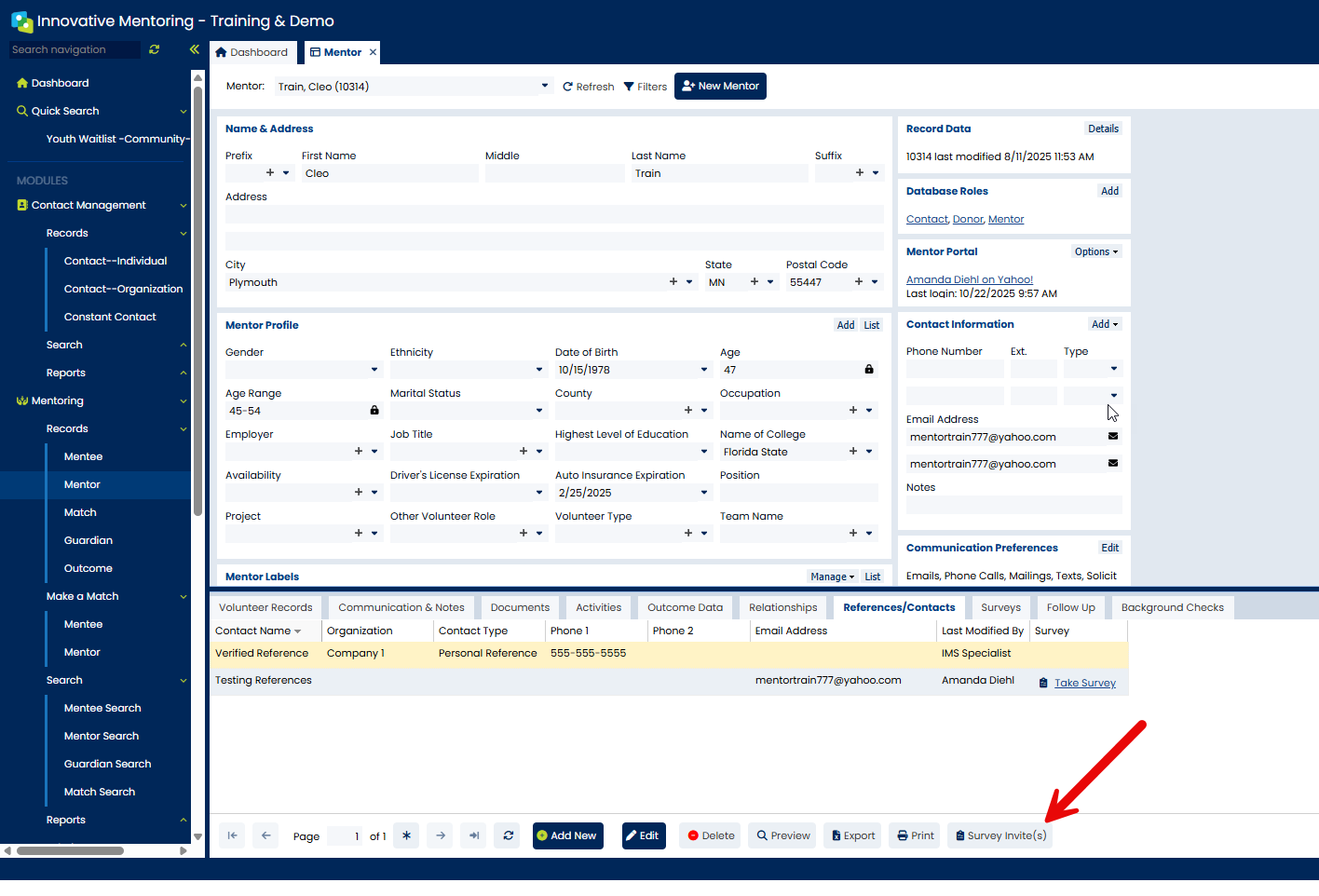 Highlight the reference you want to send the check to and click “Survey Invite”