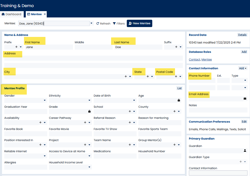 “Forms” will create a Mentor or Mentee record and the information from your applications will be mapped into fields in your database: