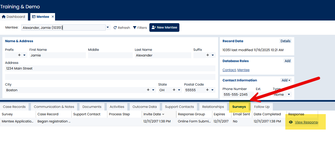 The “Surveys” are individual links that you would send out from the database after the Mentee, or Mentor already has a record in the database. They do not map into fields like the forms do, but you’d collect the information for aggregated reporting. You will see the results to your surveys here: